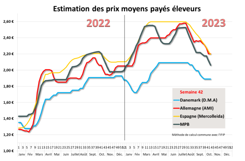 Le MPB a enregistré deux baisses dans la semaine dont une baisse maximum de 1 centime le lundi 16 octobre, suivie le jeudi 19 par un nouveau retrait de 4,1 centimes. Les récentes baisses du prix du porc semblent favoriser une meilleure demande des abattoirs puisque l’activité à 354 389 porcs abattus est en hausse de quelques 4 500 porcs par rapport aux 4 semaines précédentes. Elle reste toutefois inférieure de 17 880 porcs en comparaison avec la même semaine 2022 (-4,8%). Les poids moyens ont haussé de 244 g à 95,33 kg et se situent au-dessus des mêmes références 2022 et 2021 de 380 et 290 g respectivement. Les données provenant du marché de Rungis, fournies par FranceAgrimer, montrent une stabilisation des tarifs en fin de semaine dernière pour un bilan hebdomadaire toutefois orienté globalement à la baisse.