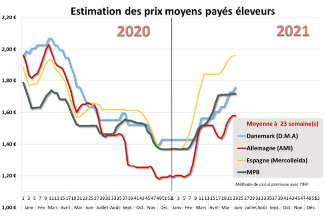 De même qu’ailleurs en Europe, le cours du porc est resté stable à l’issue de cette 23ème semaine 2021. La faible amplitude des enchères a montré une grande homogénéité dans les positions à l’achat de tous les outils. Les nouvelles possibilités d’accueil pour les restaurants, le couvre‐feu repoussé à 23h, les températures estivales … n’ont pas donné l’élan nécessaire à une moindre hausse du cours du porc. Les entreprises françaises sont aussi confrontées au ralentissement de l’export, à la concurrence intracommunautaire et à un marché intérieur qui n’a pas encore retrouvé son niveau de pré‐pandémie.