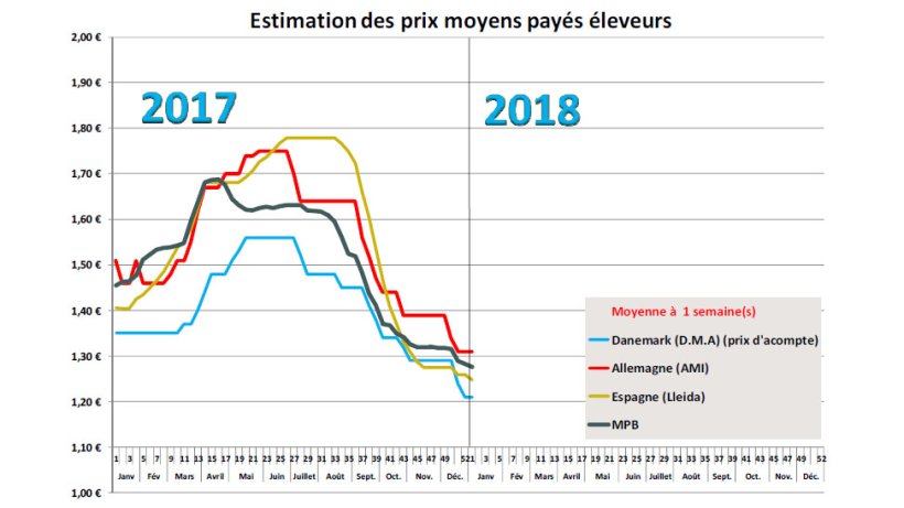 Le marché espagnol subit également les contrecoups de la succession des fériés de fin et début d’année avec une accumulation des offres et une remontée spectaculaire des poids. Comme dans le reste de l’Europe, cette hausse des poids est synonyme de plus de volume de viande sur les marchés en cette période de moindre demande. Le temps est‐il à la congélation ?, les prix sont‐ils suffisamment bas pour stocker ? La demande chinoise est à présent plus faible car les commandes pour le Nouvel An chinois, qui débutera le 16 février, sont maintenant terminées. La question qui se pose est le comportement de ce grand consommateur et importateur de viande de porc au printemps prochain ! Pour le moment, la filière porcine espagnole s’attend à voir le marché sous pression durant tout le mois de janvier. L’année débute avec une première baisse de 0,8 cent, baisse relativement modérée, certainement atténuée par la stabilité du prix allemand. La référence espagnole reste basse par rapport à celles de ses partenaires européens, tenue par la nécessité de bien se positionner face à ses concurrents sur les grands marchés internationaux, car même si les cours américains montrent quelques signes à la hausse, les écarts de prix sont toujours favorables aux viandes d’outre‐Atlantique.