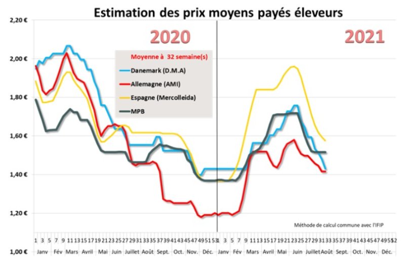 Une fois de plus, le recul du prix d’acompte danois est important puisqu’il perd pour un équivalent de 6 centimes d’euro. Le retrait des achats chinois oblige le marché danois à se recentrer sur l’Europe et à adapter son prix à un commerce terne et une concurrence forte. Cette nouvelle baisse conduit le prix payé danois sous le prix payé allemand. Cela est évidemment de mauvais augure concernant l’évolution prochaine des marchés dans le nord de l’Europe.