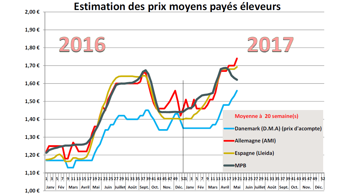 Au début du mois de février, le cours français s’est retrouvé leader des cotations européennes, poursuivant sa progression depuis le début de l’année, marché après marché, et ce, malgré des périodes de stabilité des cours du Nord de l’Europe. Le système de marché aux enchères a été favorable aux éleveurs durant cette période, caractérisée par une offre inférieure aux besoins des abattoirs dont l’activité n’a été entravée par aucun férié depuis début novembre 2016. Le férié de Pâques n’a pas été un problème en matière de retard d’enlèvement ; c’est à l’approche des multiples fériés de mai que la tendance s’est inversée donnant un avantage certain aux abattoirs dont les besoins ont été moindres, d’autant plus que la demande des produits de saison, comme ailleurs en Europe, s’est révélée assez décevante. La crainte d’une accumulation de retard à conduit les vendeurs à éviter trop d’invendus et à accepter les enchères qui ont abouti à cette baisse de 6,7 cents depuis 1 mois. La courbe des poids moyens d’Uniporc Ouest traduit ces retards accumulés qui ont amené les poids à leur plus haut niveau cette année. L’activité de cette semaine à 5 jours d’abattage, qui s’élève à 368 160 porcs, a permis de résorber déjà une partie des retards puisque les poids sont en repli de 155 g à 95,61 kg. Ce retour rapide à la fluidité démontre une offre réduite qui se révèlera entièrement lorsque l’on sortira de cette période riche en jours chômés.