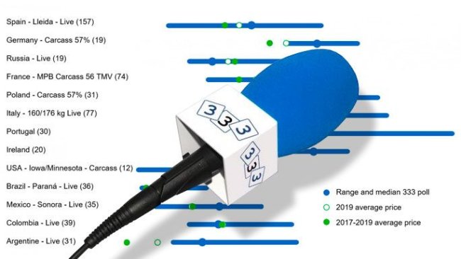 Comme chaque année, et grâce à la collaboration des utilisateurs de 333, nous pouvons connaître les prévisions concernant le prix du porc pour l’année 2025 dans 16 marchés représentant 3 continents différents. Pour cela, nous avons lancé une enquête en début d’année, dans laquelle nous avons demandé quel prix moyen ils prévoyaient pour l’année en cours. Les résultats sont présentés dans le graphique ci-dessous.