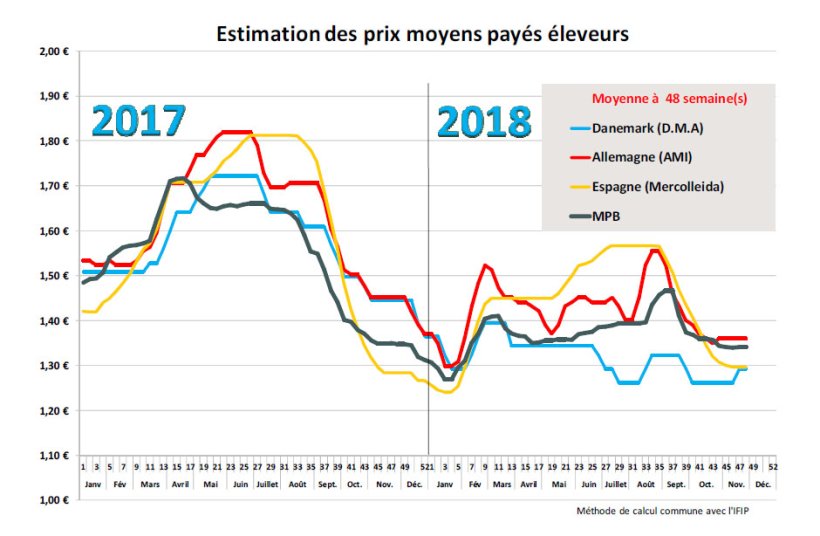 En Espagne, la situation est équivalente à celle des pays du Nord de l’Europe, à savoir des offres importantes et des abattages conséquents qui n’arrivent pas encore à infléchir la courbe des poids qui progresse toujours, tout en se maintenant sous la même référence de 2017 de l’ordre de 300 grammes environ. Le jeudi 6 décembre sera férié dans toute l’Espagne, mais la majorité des abattoirs devrait travailler car la fin de l’année est proche avec son ralentissement traditionnel d’activité. Le 6 décembre, étant un jeudi, habituel jour de la fixation du prix, celui-ci est donc fixé pour 2 semaines.