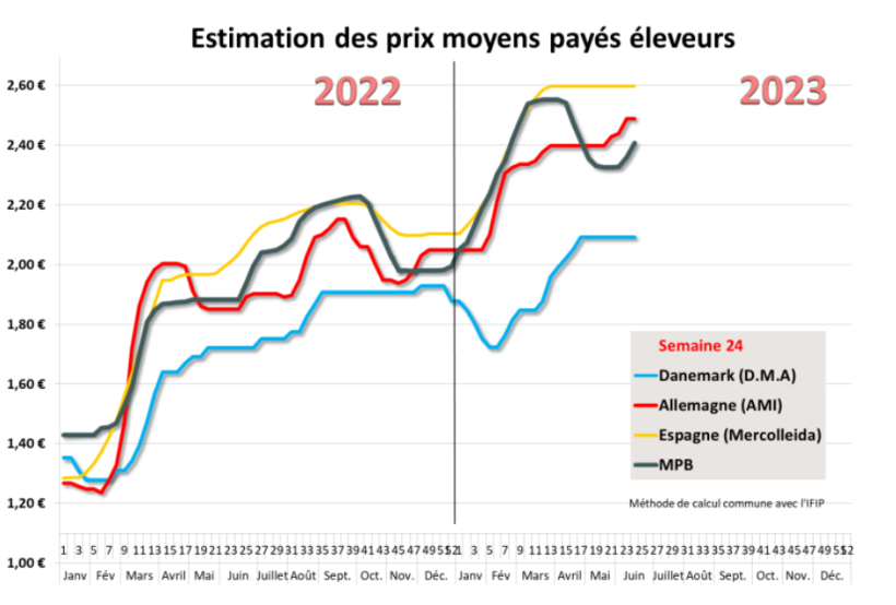 Pour la troisième séance consécutive, les abattoirs ont enchéri au niveau de la vente obligatoire pour assurer leur approvisionnement en porcs, les groupements vendeurs ne pouvant refuser la vente de leurs porcs lorsque l’enchère se situe au moins à 3 centimes au-dessus de la moyenne précédente le jeudi (et 1 centime le lundi). Après une activité élevée la semaine 23 qui compensait le ralentissement de la semaine 4 de la Pentecôte, les derniers abattages ont révélé le niveau réel de la production de cette fin de printemps. Avec 359 376 porcs abattus, l’activité retrouve son niveau d’avant les fériés et devrait s’amenuisée progressivement. Plus révélatrice encore, la baisse des poids s’accélère : après une baisse de 500 grammes, les poids ont reculé de 472 grammes la semaine dernière pour s’établir à 95,82 kilos, 918 grammes toutefois plus élevés que les poids de la même semaine 2022. Avec 2 fériés supplémentaires en 2023 (les 1 er et 8 mai), les abattages sur la zone Uniporc Ouest sont en repli de 5,7 %, soit une baisse de 510 200 porcs, ou 21 260 porcs de moins par s