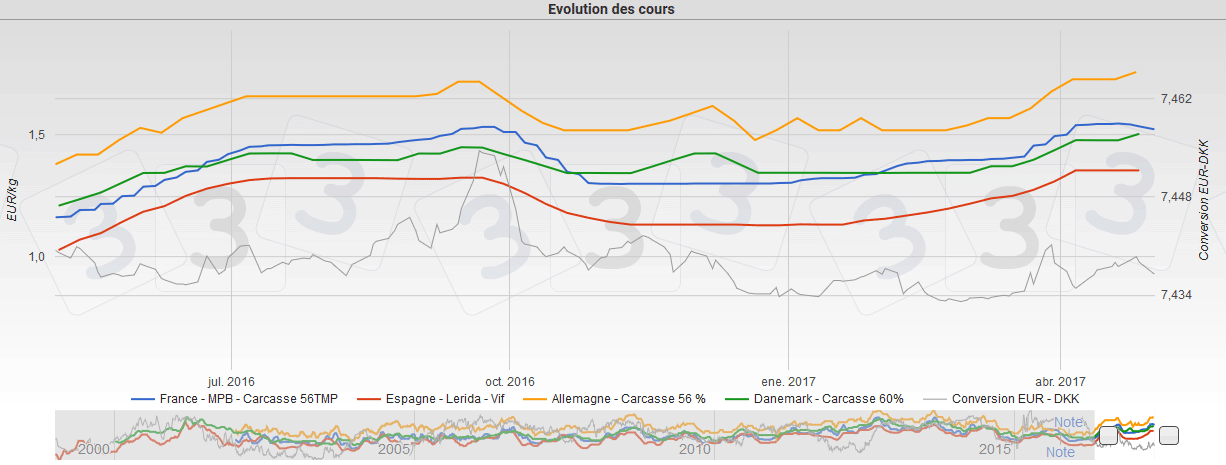 Sur ces quatre premiers mois de 2017, l'Espagne dans son ensemble a abattu 1% de moins que sur les quatre premiers mois de 2016. C'est une réalité et cela justifie –seulement en partie– le parcours à la hausse consistant vécu : 11 semaines consécutives de hausse, du 26 janvier au 6 mars. 22,30 centimes par kg en 11 semaines. Ce n'est rien, chapeau bas !!