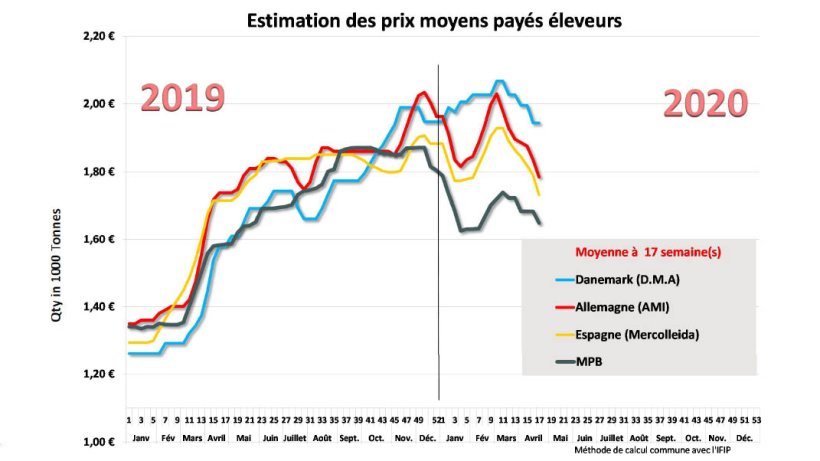 En Espagne, la baisse du cours s’est accélérée la semaine passée puisqu’elle est de 4,5 cents du kilo vif. Le poids des récents fériés s’est fait sentir mais c’est la forte détérioration du marché de la viande qui est à l’origine de la baisse. La production espagnole toujours en croissance nécessite toujours plus de débouchés qui font parfois défaut actuellement. Les restrictions de déplacement ont et auront certainement un impact sur son activité touristique, le commerce intracommunautaire est au ralenti et le commerce sur le grand export subit également la forte concurrence d’exportateurs aux tarifs bien plus avantageux.