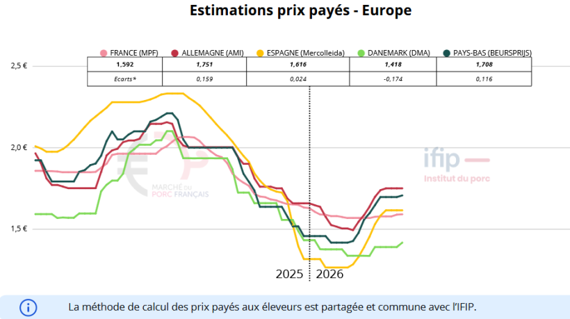 En Allemagne, le marché reste globalement équilibré. Les porcs disponibles se vendent rapidement et l’offre couvre la demande, malgré quelques tensions localisées au sud. Le marché de la viande demeure peu dynamique. Certains producteurs poussent pour une hausse (+5/+10 ct), mais le prix directeur reste finalement stable pour le moment. La pression ressentie en Allemagne se concrétise en revanche pour les pays voisin au Pays-Bas et Danemark.