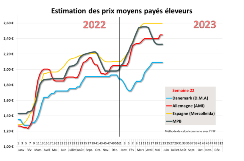 Au Danemark, après les hausses du mois d’avril, le prix d’acompte de Danish Crown est demeuré parfaitement stable durant le mois de mai. Sur les 4 premiers mois de l’année, les abattages danois enregistrent une baisse de 16,5%, soit plus de 1 million de porcs de moins qu’en 2022 sur la même période.