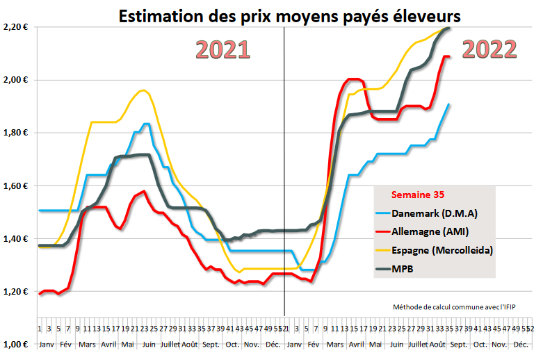 En Espagne, septembre sonne la fin des congés et le retour des salariés dans les abattoirs qui vont devoir travailler, dès à présent, 5 jours par semaine. Il va donc falloir abattre plus de porcs pour rentabiliser les coûts de production, le problème est que l’offre reste encore inférieure à la demande ce qui devrait maintenir la fermeté des cours pour un temps encore. Comme ailleurs, les poids remontent un peu avec la fin des grandes chaleurs mais ils restent exceptionnellement bas, jusqu’à 3 kilos inférieurs aux mêmes références 2021. Le retour de la Chine se précise mais, si les volumes sont en hausse, les tarifs appliqués sont encore très bas. Les exportateurs sont confrontés à un dilemme qui consisterait à baisser les prix du porc pour vendre plus de viande, ce qui est impossible au regard de la faiblesse actuelle de l’offre.