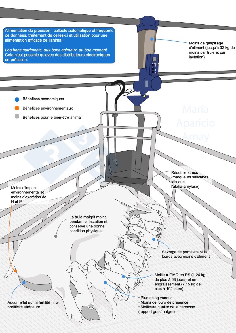 L'infographie qui accompagne cet article résume de manière visuelle les principaux avantages observés dans diverses études récentes et qui sont bien décrits dans l'article « Alimentation de précision chez les truies allaitantes : la voie vers la durabilité et l'efficacité » que nous avons publié il y a quelques temps.