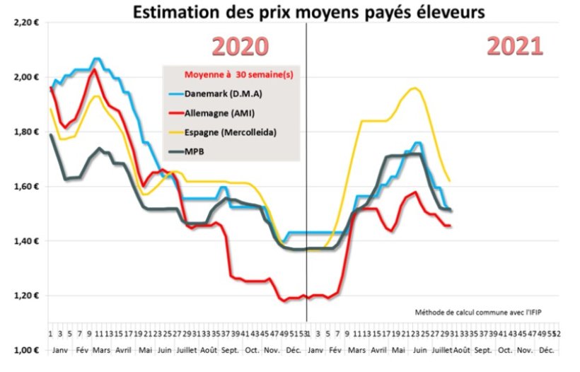 Le prix de base au MPB a baissé de 13,5 cents au cours du mois de juillet, la moyenne mensuelle s’élève à 1,372 euro contre 1,306 euro en juillet 2020. La moyenne cumulée depuis le début de l’année s’établit à 1,376 euro (‐4,6% par rapport à la même période 2020).