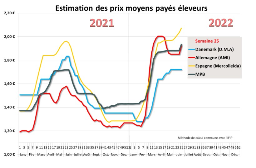 Après une légère amorce de 0,3 cent le lundi 20 juin au MPB, le prix du porc a enregistré sa hausse maximum au cours de la séance du jeudi 23 juin. Les abattoirs ont enchéri de manière à obtenir rapidement les 5 centimes dès les 25 premiers lots. Comme constaté ailleurs en Europe, les offres sont à présent inférieures à la demande. L’activité d’abattage sur la zone Uniporc s’est élevée à 374 921 porcs, en baisse de plus de 6 000 porcs par rapport à la semaine précédente tandis que les poids ont, une fois de plus, baissé de 375 grammes à 94,53 kilos. Les poids ont ainsi chuté de 730 grammes en 2 semaines consécutives et se situent à un niveau inférieur aux mêmes semaines des 3 dernières années.