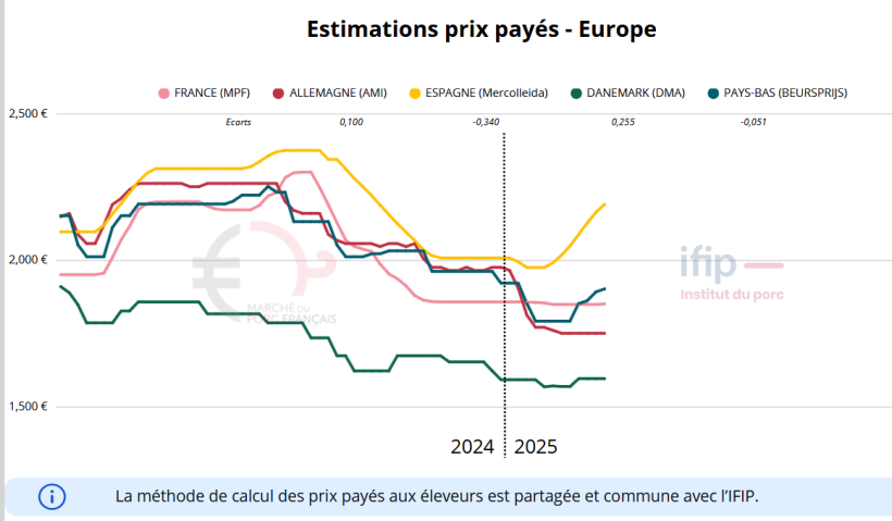 La tendance reste la même en Espagne, avec un cours qui continue de progresser. Le marché de la viande demeure un élément moteur, et les importations de porcs se maintiennent à des niveaux historiquement élevés. Néanmoins, l’écart avec les autres pays européens commence à se faire ressentir, et la hausse a été moins significative cette semaine. Le marché espagnol reste toutefois un moteur pour l’Europe et, désormais, seule l’Allemagne résiste à cette dynamique.