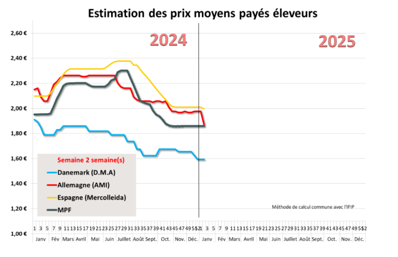Les abattages en Espagne ont diminué de 25 % par rapport à l'année dernière, bien que la hausse des poids moyens des porcs soit limitée (+1,5 kg). Rappelons que le pays a connu l’équivalent d’une semaine complète en jours fériés pendant les fêtes. Malgré la baisse des abattages, les stocks restent raisonnables et la demande semble soutenue. Aucun retard important n’est anticipé d’ici deux à trois semaines, et le prix est resté stable cette semaine. Cependant, la position des autres pays pourrait influencer le marché à moyen terme.