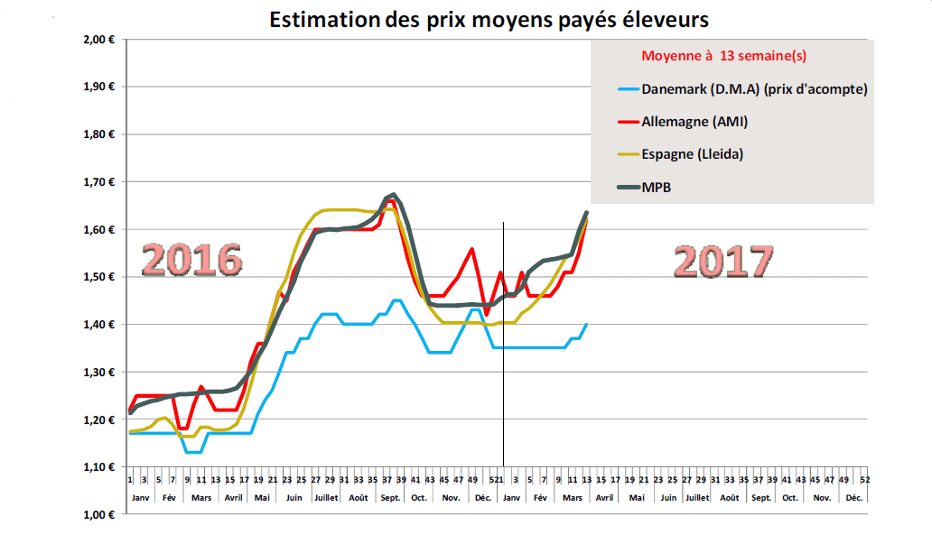 Les hausses récentes ont amené les principales cotations dans un mouchoir de poche, avec un prix français toujours leader. Le prix d’acompte danois reste largement distancé malgré les récentes hausses (‐24 cts environ). Les niveaux de prix atteints en cette fin mars sont équivalents ou se rapprochent des meilleures références de 2016. Alors que la demande s’anime à l’approche des beaux jours, l’offre se rétracte sérieusement et entre dans une ère de grande pénurie.