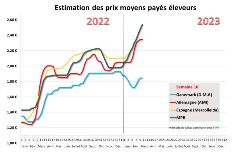 Le prix du porc au Marché du Porc Breton poursuit son ascension avec 6 centimes supplémentaires la semaine passée pour un cours qui s’établit à 2,366 euros. La séance de vente du lundi 6 mars s’était toutefois démarquée des séances précédentes puisque les abattoirs s’étaient vus refuser 1735 invendus avant d’enchérir au niveau de la vente obligatoire. Cependant, la vente du jeudi 9 mars a renoué avec les tendances des semaines précédentes et s’est terminée sur une hausse maximum de 5 centimes. L’activité sur la zone Uniporc Ouest s’est repliée de 8 939 porcs par rapport à la semaine précédente, conséquence probable des mouvements sociaux apparus en milieu de semaine. Les abattages n’ont pas dépassé les 346 990 porcs, en baisse significative de 9,7% par rapport à ceux de la même semaine 2022 (384 132 porcs). Malgré ce recul de l’activité, les poids ont baissé de 92 grammes à 95,78 kilos.