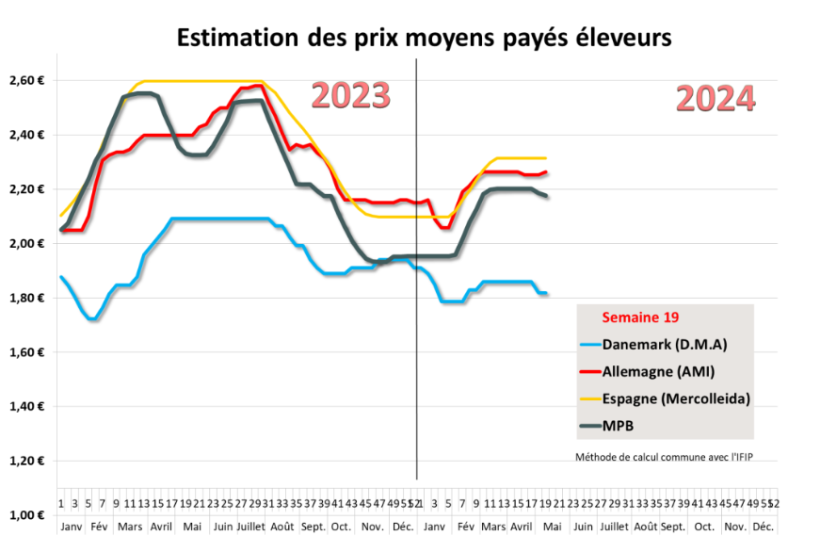 Au Marché du Porc Breton, les 2 séances hebdomadaires se sont tenues en début de semaine en raison des 2 fériés du 8 et 9 mai. Le cours s’est replié de 0,6 centime le lundi 6 mai et de 0,4 centime le mardi 7 mai. La baisse du cours tend donc à ralentir avec une amélioration de la demande sur le marché de la viande, stimulée par de meilleures conditions météorologiques durant cette semaine particulière où les 2 fériés ont été l’occasion pour beaucoup de français de prolonger le week-end. D’autre part, de nombreux abattoirs ont poursuivi leur activité le jeudi 9 mai (jour de l’Ascension) et les abattages de la semaine s’élèvent finalement à 281 091 porcs, les poids ont logiquement augmenté de 566 grammes pour s’établir à 96,61 kilos. Dans son communiqué du 7 mai 2024, Inaporc et toute la filière porcine se félicitent de l’accord signé avec la Chine qui va permettre d’exporter les abats blancs de porcs français vers la Chine (estomac et intestins…). Selon Inaporc, cet accord va prendre effet immédiatement sur les exportations et va générer une augmentation du chiffre d’affaires à l’export vers la Chine d’environ 10%.