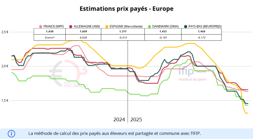 En Allemagne, la situation est particulière, dans la mesure où aucune pression baissière sur les prix n’est actuellement évoquée en Allemagne, alors même que plusieurs pays voisins ont procédé à des corrections négatives. Le marché y demeure inchangé, ce qui constitue un signal positif pour l’ensemble du marché européen. Les niveaux d’abattage restent élevés, mais l’équilibre entre l’offre et la demande semble préservé. La stabilité devrait se maintenir sur les deux prochaines semaines, même si les acteurs resteront très attentifs aux chiffres de début janvier afin d’anticiper un éventuel réajustement après les fêtes.
