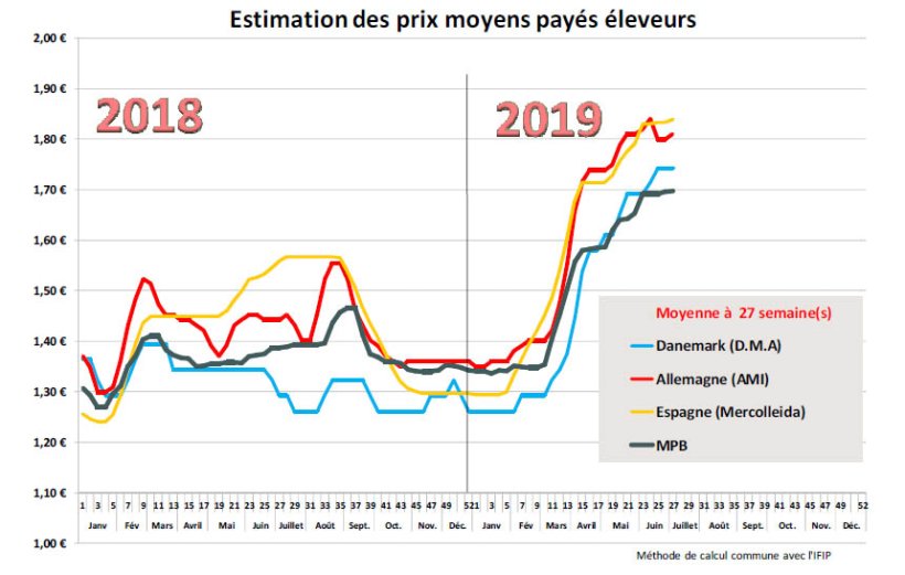 En Espagne, la hausse du cours de 0,5 cent est relativement mesurée comparée à la chute vertigineuse des poids (près de 900g), mais en Espagne aussi, le marché de la viande pèse sur l’évolution du cours du porc qui, selon les experts espagnols, ne devrait pas connaitre sa traditionnelle ascension estivale mais plutôt tendre vers une relative stabilité jusqu’à la fin août (début septembre) où la demande chinoise est attendue en hausse s’accompagnant d’un rebond des marchés du porc vivant.