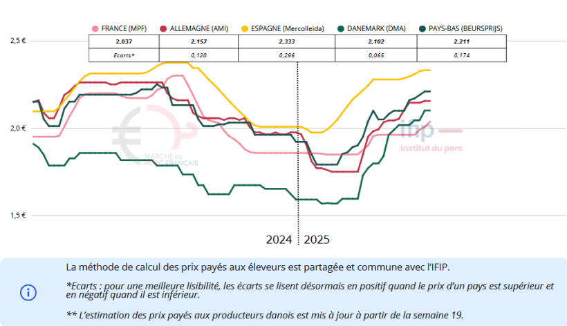 En Allemagne, le marché reste partagé : les abattoirs dénoncent une demande faible, anticipant une baisse des prix et une réduction des volumes, tandis que les engraisseurs estiment que les flux restent maîtrisés. Malgré une hausse de l’offre dans certaines régions, les volumes ont trouvé preneurs.