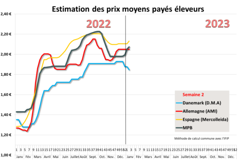 Au Marché du Porc Breton, la hausse du cours du porc se poursuit avec +2,3 cents pour un cours qui s’élève à 1,901 euro après notamment une hausse de 2 centimes le jeudi 12 janvier. Cette progression du cours ne s’est pas faite sans mal car 4 120 porcs ont été refusés à la vente par les groupements vendeurs pour enchères insuffisantes obligeant ainsi les abattoirs à enchérir au moins au niveau de la vente obligatoire à + 3 centimes pour assurer une partie de leurs achats. La demande des abattoirs se fait moins pressante pour cette nouvelle semaine qui commence mais les offres sont également en baisse et ne suffisent pas totalement aux besoins des entreprises. Les abattages de la première semaine de l’année s’étaient élevés à 389 794 porcs, en repli de 4,3 % par rapport à l’activité de la première semaine 2022. De même, les abattages de la deuxième semaine s’établissent à 373 701 porcs (- 16 093 porcs / sem 01), en baisse également de 4,6 % en comparaison avec la même référence 2022. De plus, les poids affichent une forte baisse puisqu’à 96 kilos, ils ont chuté de 353 grammes et se trouvent 781 grammes inférieurs aux poids d’il y a un an.
