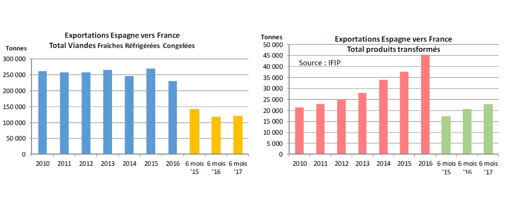 Certains avancent l’entrée en France de viandes étrangères et en particulier espagnoles. Mais les statistiques du 1er semestre 2017 sur les exportations espagnoles en direction de la France ne montrent pas de hausses significatives des volumes de viandes Fraîches Réfrigérées, Congelées qui constituent 75 % des volumes totaux espagnols à destination de la France. Sur 6 mois, les volumes 2017 sont même moins élevés que sur le premier semestre 2015. 2016 est plus difficilement comparable car d’énormes volumes étaient alors destinés à la Chine.