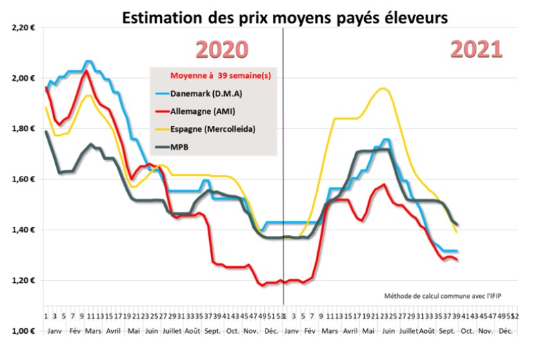 Au Marché du Porc Breton, la baisse hebdomadaire a été de 1,5 cent avec une baisse plus modérée à l’issue de la séance du jeudi 30 septembre puisque le prix moyen a reculé de 0,4 cent ce dernier marché de septembre. Pour autant, le nombre de porcs sans enchères a été élevé (17,4% des porcs présentés) dont une grande partie a pu être affectée aux abattoirs. Cela démontre quand même une demande sans ressort dans un contexte européen aux prises avec d’énormes volumes de viande à écouler. Ce moindre repli de la cotation française place maintenant le prix français en tête des cotations européennes puisque le prix espagnol a reculé plus fermement de 3,3 cents du kilo vif. Après la sensible baisse des abattages précédents, l’activité de la semaine passée a fait un bond de 10 519 porcs supplémentaires pour total de 373 912 porcs abattus, les poids restent toutefois en hausse de 207 g à 95,05 kilos
