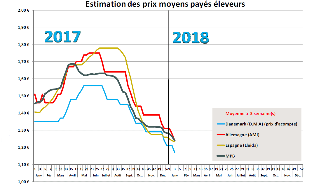 Avec une baisse de 4 cents, la cotation officielle allemande s’aligne sur les prix maisons pratiqués par un grand nombre d’abattoirs la semaine passée, à l’initiative des plus importants tels que Tönnies, Westfleisch et Danish Crown. Les producteurs n’ont pas eu d’autres choix face l’abondance de l’offre et des poids élevés alors que la demande en viande de porc dans cette seconde partie de janvier est plutôt calme. Le commerce de la viande se caractérise par une faiblesse de la demande et des concessions de prix sur les jambons, côtes et longes. Devant cette absence de commerce, le recours au stockage en frigo est de rigueur comme souvent en janvier. Dans le Sud et l’Est du pays, les offres se réduisent petit à petit pour un meilleur équilibre de marché. Toutefois, ce n’est pas encore la norme sur l’ensemble du territoire et les poids à 97 kilos de moyenne attestent d’une offre encore élevée. A 1,30 € de prix de base, la cotation allemande a‐t‐elle atteint le point bas pour ce début d’année ? Les offres sont annoncées plus faibles dans les semaines à venir et pourraient contribuer à la reprise du commerce.