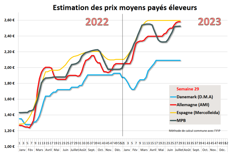 De même en Espagne, la cotation de Mercolleida a été reconduite à son plus haut niveau et ce pour la quinzième semaine consécutive. Les poids ont fortement baissé depuis 3 semaines mais restent cependant très largement supérieurs aux mêmes références de 2022. Les mises en marché de porcs charcutiers sont un peu plus importantes depuis quelques semaines car les éleveurs ont besoin de place pour les porcelets. Toutefois le niveau de l’offre ne devrait pas remonter de sitôt en raison des températures très élevées de jour comme de nuit qui compromettent la croissance des animaux. L’inquiétude actuelle se porte sur l’évolution des cours des céréales depuis l’annonce par la Russie de la fin de l’accord sur le corridor céréalier de la Mer Noire.
