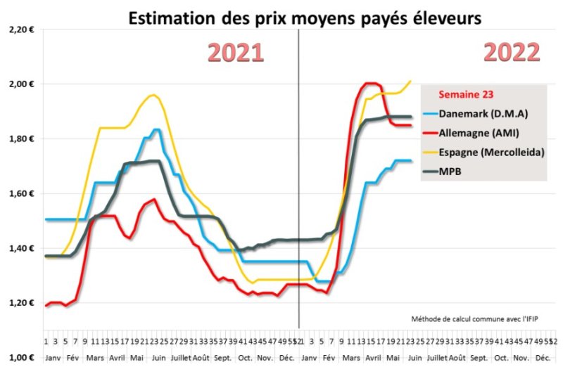 En Espagne, la situation ne diffère pas des semaines précédentes : les offres sont de plus en plus faibles, les fortes chaleurs impactant la croissance des porcs, et les poids ont chuté de près de 2 kilos en 3 semaines, ils sont à présent sous les niveaux des mêmes semaines 2021 et 2020 ! Le problème demeure toujours et encore une faible demande sur le marché de la viande largement pourvu depuis le volumineux retrait des achats chinois : sur les 2 premiers mois de l’année 2022, selon les données disponibles jusqu’à présent, l’Espagne a exporté 200 000 tonnes en moins vers la Chine. Si les ventes ont progressé vers d’autres pays de l’Est asiatique (Corée du sud, Philippines, Japon, Taïwan), les exportateurs espagnols se sont retournés vers le marché européen et notamment ses partenaires historiques : France, Italie et Portugal.