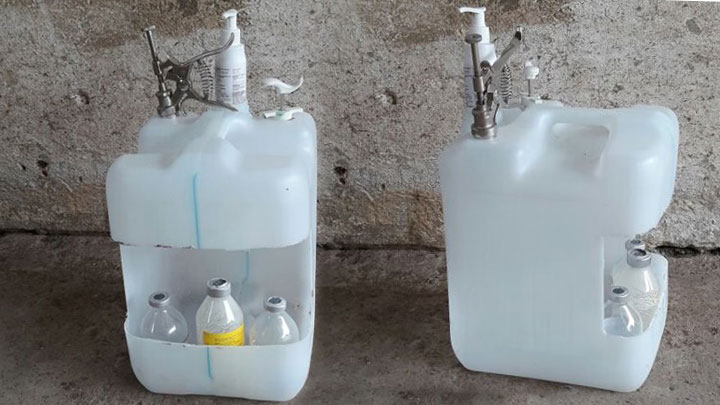 A l'aide du cutter nous réalisons une fenêtre sur un bidon de 20/25 litres (de désinfectant ou d'eau distillée par exemple), sur le côté étroit de l'autre côté du bouchon, à environ 10 cm de la base inférieure et de la supérieure, avec un espace suffisant pour introduire les différents flacons et aiguilles de réserve.