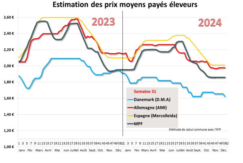 La situation reste stable avec une reconduction des prix. L’activité de la semaine dernière est restée supérieure à celle de l’année dernière, bien que le début d’une baisse d’activité soit perceptible. Les poids ont diminué de 200 g la semaine dernière et devraient rester stables cette semaine. Quelques porcs invendus sont à prévoir, sans impact significatif sur les prix. Aucun changement majeur n’est attendu avant le 8 janvier, mais une pression à la baisse pourrait émerger à partir de la deuxième semaine de janvier.