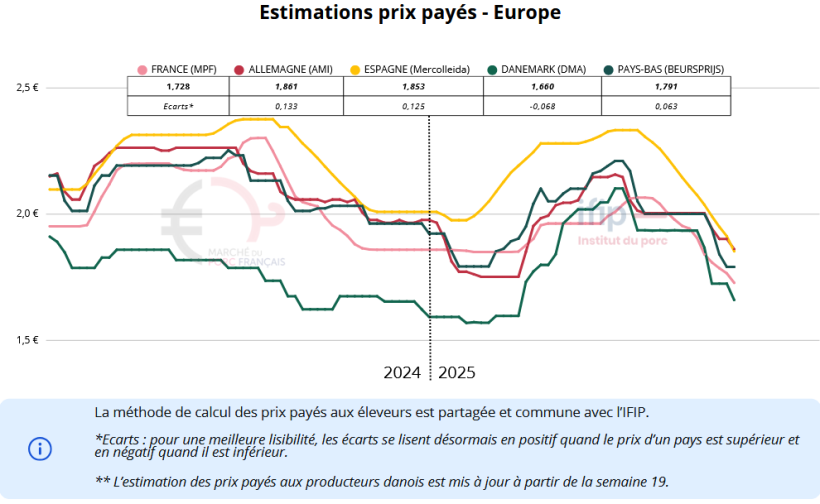 En Allemagne, la pression s’est accentuée la semaine dernière. La réduction du nombre d’abattages hebdomadaires entraîne un excédent croissant de porcs, notamment dans le nord-ouest du pays. Le sud présente un équilibre un peu meilleur, mais les disponibilités y restent également supérieures aux besoins. Il en résulte une hausse du poids moyen des animaux abattus, en progression de 200 g sur une semaine. Le marché de la viande ne donne toujours pas de signaux positifs. Les abattoirs agissent avec prudence, ne souhaitant pas stocker ou congeler de la viande à des prix jugés trop élevés. Si certains estimaient qu’il fallait limiter la baisse du prix directeur à 10 centimes, c’est finalement une baisse de 15 centimes qui est avancée.