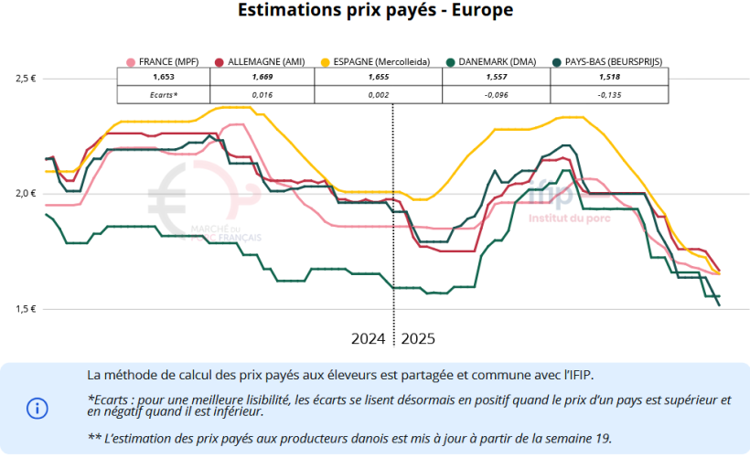 En Italie, la pression baissière persiste. Les prix italiens restent trop élevés au regard des niveaux européens. Le produit est certes différent, avec des carcasses plus lourdes, mais l’écart de prix demeure trop important pour être soutenable. Les négociations ont malgré tout abouti cette semaine, une nouvelle fois sur une baisse notable.