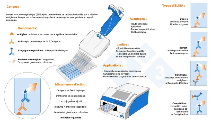 Sa haute sensibilité, sa spécificité et son prix abordable font du test ELISA un outil indispensable dans les routines de laboratoire. Cette infographie explique de manière visuelle et objective les mécanismes, les composants et les principales variantes de ce test.