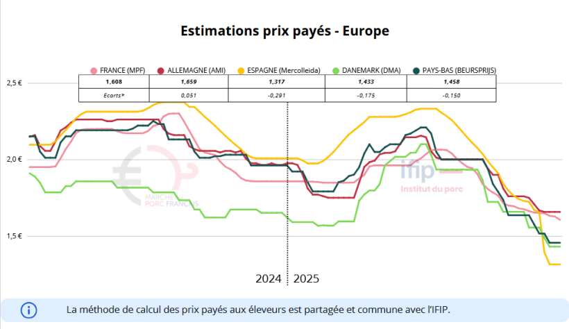 Alors que la stabilité observée en Europe ces dernières semaines laissait anticiper un prix du MPF relativement inchangé durant la semaine de Noël, le déroulé du marché de jeudi a inversé le scénario. Plusieurs positions d’achat, marquées par des propositions jusqu’à –5 centimes, ont nettement tiré la moyenne vers le bas. Résultat : entre le 22 et le 24 décembre, le prix moyen a reculé de 2,6 centimes, dont 2,5 centimes sur la seule séance de jeudi.