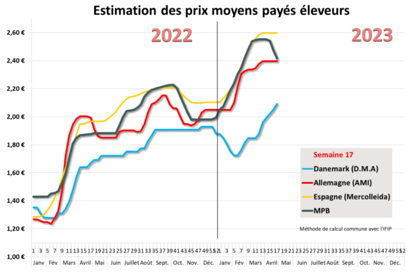 Au Danemark, le prix d’acompte est resté stable pour cette nouvelle semaine après une série de 6 hausses consécutives qui ont totalisé 24 centimes d’euro permettant ainsi à la référence de réduire le grand écart avec les autres principales références. Le week-end prolongé du 1er mai n’a pas été propice à une amélioration de la demande faute de conditions météo profitables à la mise en service des barbecues.