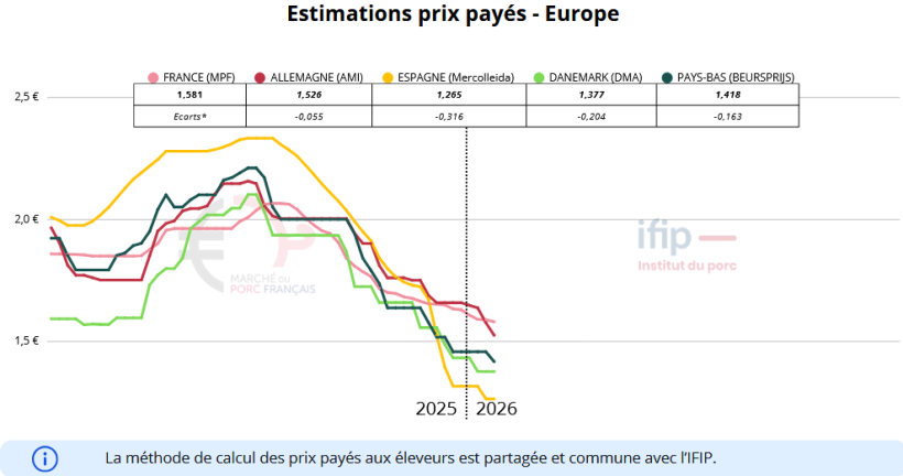 En Allemagne, la forte baisse récente a permis de réduire une partie des excédents, avec un niveau d’abattage élevé la semaine dernière, particulièrement important pour cette période de l’année. Les poids ne reculent toutefois que très légèrement, signe que des excédents persistent encore. Néanmoins, la dynamique va dans le bon sens et, à ce stade, aucun acteur n’évoque de nouvelle baisse. Les producteurs espèrent ainsi avoir atteint un point bas. Le principal point de fragilité reste le marché de la viande, où les opérateurs allemands subissent une concurrence accrue.