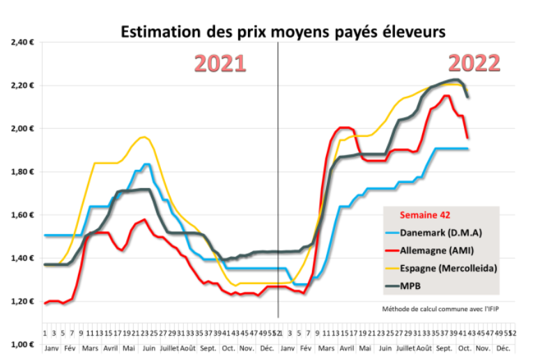 En Chine, le cours du porc s’établit à 28,46 CNY le 21 octobre 2022 (4,024 euros). Selon Zonebourse (Reuters), la Chine s’apprête à mettre sur le marché le sixième lot de porc congelé provenant des réserves d’Etat afin de stabiliser le prix.