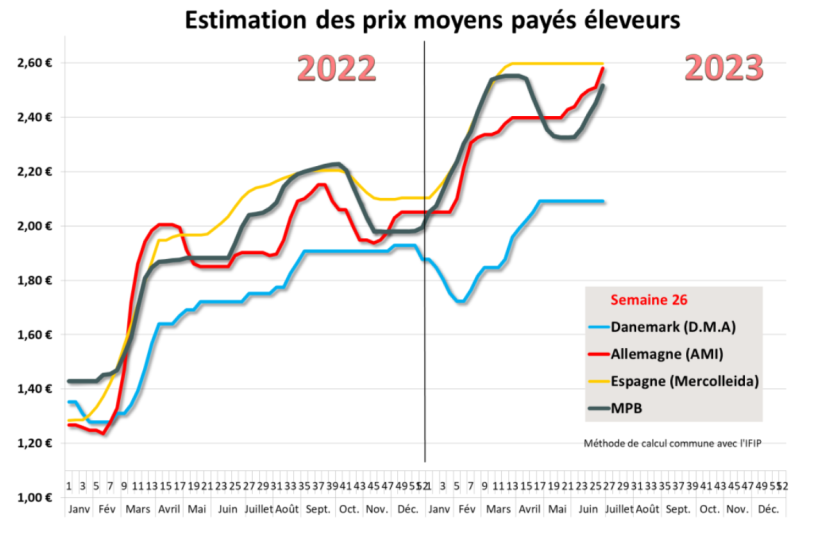 En Espagne, la référence de Mercolleida est reconduite pour la treizième semaine consécutive alors que les abattoirs commencent à faire pression pour baisser ce prix pour retrouver de la compétitivité sur les marchés de l’export et réduire ainsi les pertes économiques. Les baisses de poids commencent à être très significatives, intensifiées par des températures caniculaires de plus en plus répétées en Espagne. Malgré tout, les poids carcasse demeurent 5 kilos plus élevés que ceux des mêmes semaines 2022.