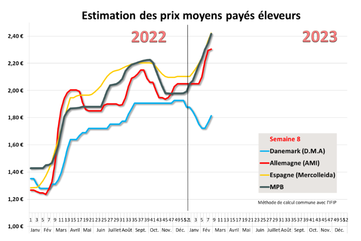 C’est le cas en Allemagne où la référence officielle a été reconduite après 28 cents de hausse en 3 semaines que le secteur de la viande va devoir répercuter à un rythme plus lent. D’autre part, selon certains commentaires nord-européens, la période du Carnaval est traditionnellement peu propice à un commerce actif alors même qu’une certaine résistance aux hausses se renforce dans le secteur de la viande. Mais il est vrai aussi que les stocks congelés ne sont pas élevés, que les fêtes de Pâques se rapprochent et que la saison des barbecues doit être anticipée avant que les pièces aient encore enchéri.