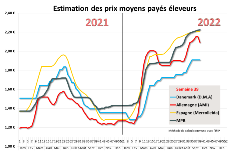 Le cours du porc au MPB est resté quasiment stable à l’issue de cette première semaine d’octobre suivant une large tendance européenne. La position dominante du cours breton rend plus complexe la répercussion du prix sur le marché de la viande, notamment sur les marchés vivement concurrencés, en particulier en cette période de forte inflation. Cependant, la demande de ce début de mois semble encore correcte, notamment parce que la viande de porc est plus abordable pour le consommateur que la viande de bœuf ou de poulet. Le prix se maintient aussi, soutenu par une offre qui demeure sous les niveaux habituellement rencontrés à cette époque de l’année où les abattages sur la zone Uniporc Ouest progressent de façon significative. Or, depuis 2 semaines maintenant, alors que l’année dernière les quantités de porcs abattus avoisinaient les 375 000 porcs, l’activité des semaines équivalentes 2022 s’établissent autour de 360 000 porcs (bases comparables) ! soit une baisse d’environ 15 000 porcs par semaine (-4%).D’autre part, les poids moyens qui avaient retrouvé rapidement de la hauteur, notamment au cours des 2 dernières semaines de septembre, se stabilisent à nouveau à 94,45 kilos, toujours 570 g sous les poids moyens de la même semaine 2021.