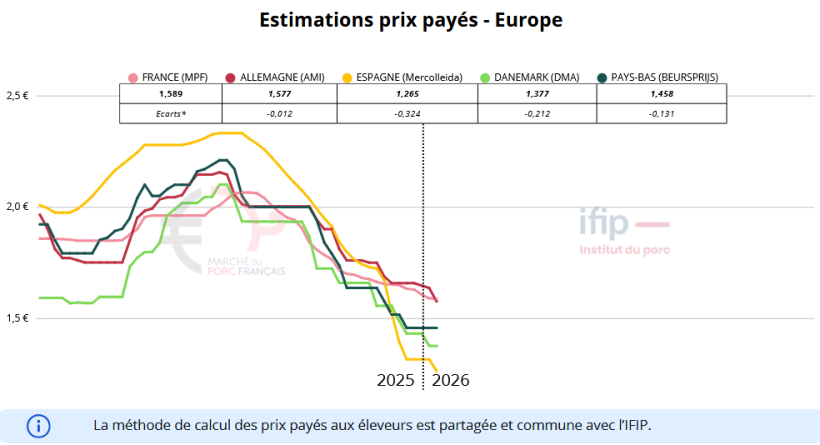 En Italie, la situation demeure fortement marquée par la période des fêtes. Le marché du porc continue de se dégrader progressivement, pénalisé par des prix toujours élevés et une consommation modérée. Dans ce contexte de pression européenne persistante, le marché italien devrait confirmer la tendance baissière observée ces dernières semaines. Le prix devrait servir de référence pour les deux semaines à venir.