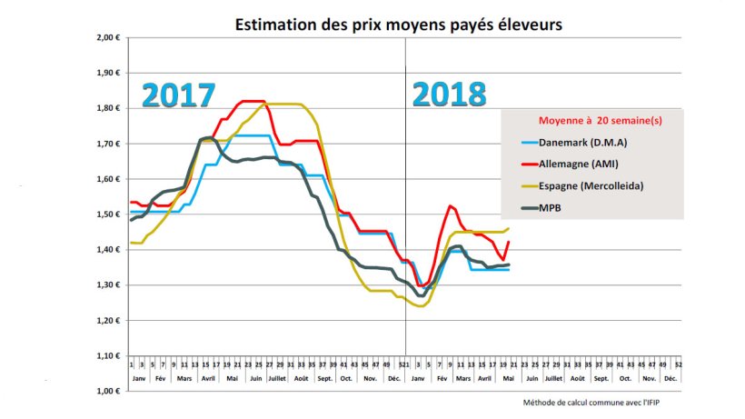 Toujours leader des cotations européennes et encouragée par la hausse allemande, la référence espagnole ose quelques 8 millièmes de hausse, révélant ainsi les incertitudes des entreprises espagnoles quant à l’avenir des exportations sur les grands marchés internationaux. Le marché est pour l’instant équilibré avec des offres saisonnières qui se réduisent peu à peu et une demande digne de la première production européenne. Les poids se réduisent chaque semaine mais se maintiennent à de hauts niveaux. Hormis le 1er mai, l’activité des abattoirs espagnols n’a pas été entravée durant ce mois. Avec le démarrage imminent de la saison estivale et l’arrivée massive des vacanciers, la demande intérieure supportera certainement l’évolution du prix mais rappelons que 50 % de la production espagnole est exportée dont près de 40 % vers les pays tiers avec la Chine comme tout premier client (suivi de près par la France). Depuis 2016, la Chine est devenue le premier débouché pour bon nombre de pays européens, elle l’est encore pour l’Espagne comme pour l’Allemagne notamment, d’où les inquiétudes des exportateurs devant la baisse générale de la demande chinoise, accentuée par une vive concurrence des grands rivaux tels que les USA, le Canada et le Brésil sur les marchés asiatiques. Le Brésil qui par ailleurs voit ses volumes vers la Chine progresser de 45 % au premier trimestre alors même que les grands fournisseurs sont en retrait.