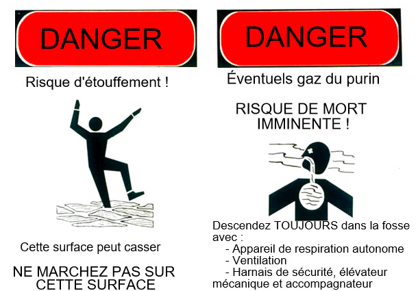 - Ne jamais rentrer dans une fosse sans un harnais de sécurité approprié et un système de poulie permettant de secourir une personne en cas de difficulté. Une autre personne doit toujours rester dehors.