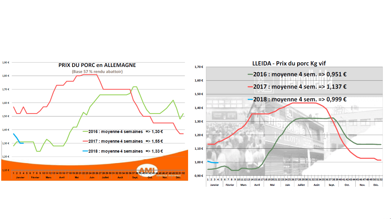 Comparés aux 4 premières semaines de l’année 2017, les cours allemands et espagnols sont en repli de 14 % et 12 % respectivement. Les niveaux de prix sont assez proches de ceux de janvier 2016, les poids en 2018 dans ces 2 pays sont toutefois plus élevés qu’en 2016. D’une manière générale, les grands pays producteurs de porcs en Europe voient leurs poids moyens atteindre des niveaux jamais atteints. En 2016 et 2017, la cotation espagnole se distinguait en début d’année par un décrochage par rapport à ses concurrentes française et allemande.
