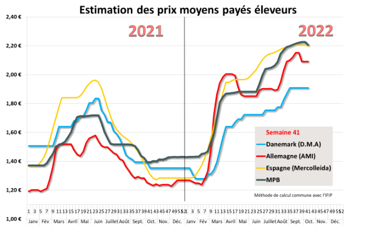 En Espagne, le cours enregistre sa première baisse cette année. Toutefois, il ne s’agit que d’une légère baisse de 0,5 cent car le niveau des offres reste insuffisant au regard des énormes besoins des abattoirs espagnols. Cependant, les poids haussent fortement puisqu’ils ont repris 3 kilos en 4 semaines (tout en demeurant en semaine 41, 1,6 kg sous les poids de la même semaine 2021). Sur le marché de la viande, les prix sont stables, les ventes à l’export tournent au ralenti. Les abattoirs souhaiteraient donc des baisses de cours pour redynamiser les ventes.
