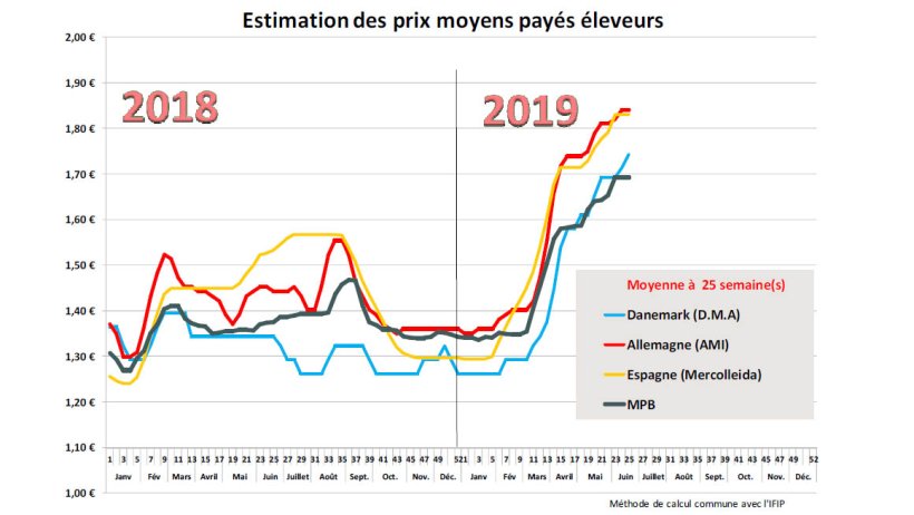 De même, au Marché du Porc Breton, le prix a été reconduit jeudi dernier pour la 4ème fois consécutive à 1,522 euro. La faiblesse des amplitudes de prix a montré une relative homogénéité des positions à l’achat des différents outils, notamment le jeudi 20 juin, où plus de 50% des lots présentés ont été vendus au prix moyen. Cette semaine 25 fait suite à la dernière semaine à jour férié d’une série de 5 en 2 mois. Malgré la faiblesse de l’offre, les besoins des abattoirs restent suffisants pour une demande intérieure calme notamment en produits à griller puisque la météo n’a pas été, pour le moment, vraiment favorable à ce type de consommation. L’activité sur la zone Uniporc Ouest reste pourtant très correcte avec 379 946 porcs abattus et surtout, la chute des poids moyens de 342 g à 95,17 kg annonce le début de la forte baisse saisonnière des poids.