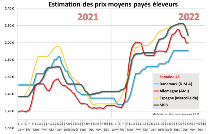 Le cours du porc au MPB s’est à nouveau replié cette dernière semaine de 6,1 centimes pour s’établir à 1,914 euro. La proximité des 2 fériés de novembre ne laisse aucune possibilité pour les groupements vendeurs de résister par le biais des invendus car l’objectif est de préserver un maximum de fluidité dans la sortie des élevages. L’activité de la semaine qui précède le férié du 1er novembre est supposée être habituellement assez élevée pour compenser en partie la perte d’activité liée au férié, pourtant les abattages de cette semaine 43 n’ont été que de 373 060 porcs, ce qui, sur des bases comparables (en soustrayant les abattoirs qui ont intégré la zone Uniporc Ouest cette année), correspond à une baisse de 10 600 porcs (- 2,8%) en comparaison avec les 378 848 porcs abattus la même semaine 2021. Est-ce en raison de la baisse de production ou cela correspond-il à une réduction d’activité des abattoirs par manque de dynamisme commercial ? Les groupements vendeurs semblent penser que le manque d’offre se fera clairement ressentir dès la sortie des fériés ! Les poids moyens ont repris 132 grammes à 95,08 kilos, 85 g supérieurs à ceux de la même semaine 2021.