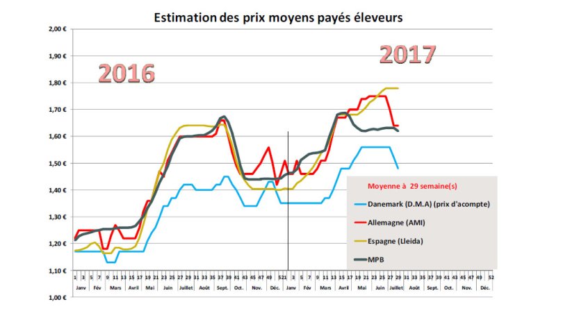 Après avoir enregistré 11 centimes de baisse en deux semaines consécutives, le prix allemand officiel s’est stabilisé mercredi dernier. Une offre faible, concrétisée par une baisse de poids de 300 g, et l’amélioration de la demande ont abouti à un marché bien plus équilibré. Les semaines passées, la faiblesse de la consommation intérieure en cette période de vacances scolaires et un commerce extérieur au ralenti avaient conduit à un réajustement de prix. Cependant, certains abattoirs, particulièrement tournés vers l’export, ont jugé cette baisse de prix insuffisante puisque des « prix maison » ont été appliqués et pourraient l’être à nouveau. Toutefois, l’extrême pression rencontrée sur les marchés les semaines précédentes a, à présent, disparu et la stabilité des cours s’est généralisée sur l’ensemble des marchés du Nord de l’Europe : Danemark, Belgique, Autriche …